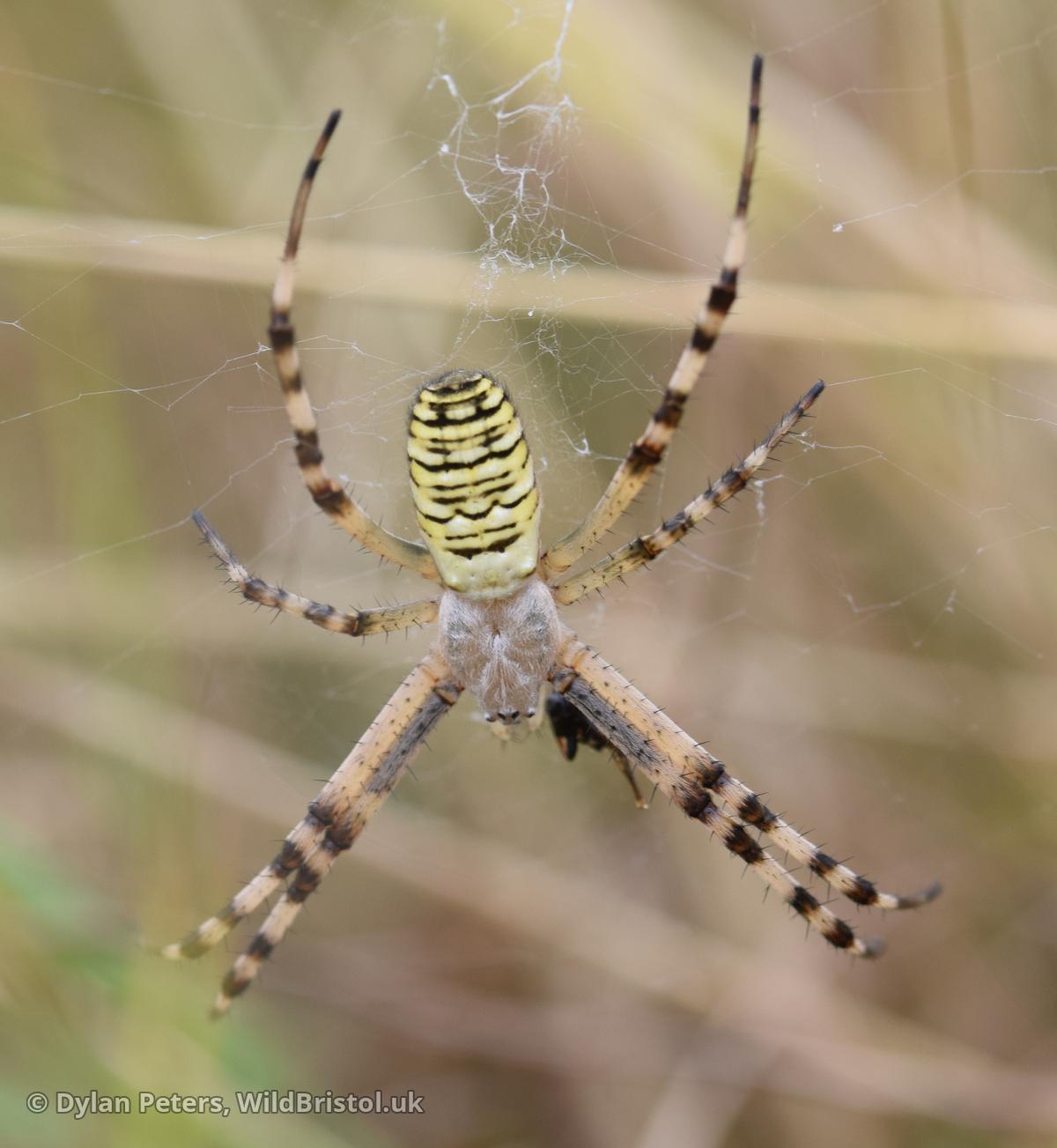 A recent colonist first recorded in Britain in 1922 (Rye, East Sussex). It is Widespread and fairly frequent in the South East but is spreading North and West. Habitat includes: rough grassland, heathland, wasteland, roadside verges etc. Length: Up to 15 mm (Females). Life story: Females spin webs low down in the vegetation with orbs reaching up to 30 cm in diameter; designed for catching mainly Grasshoppers and Crickets but also other invertebrates. Seen: April to October.