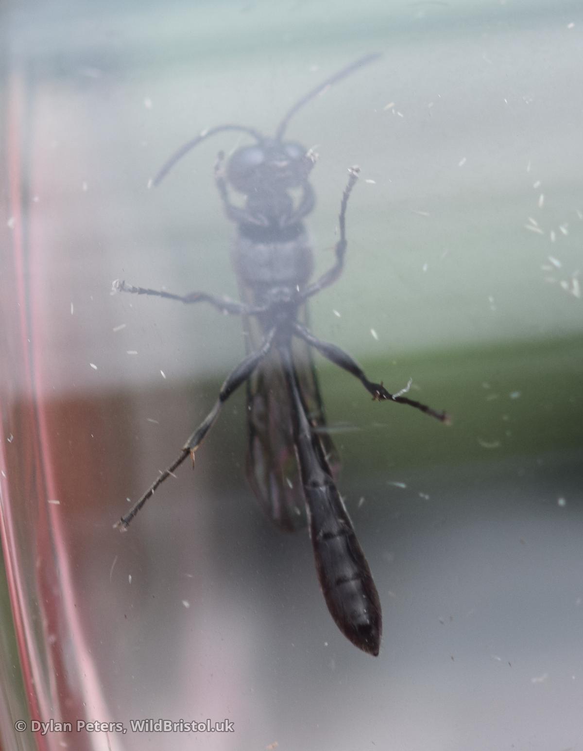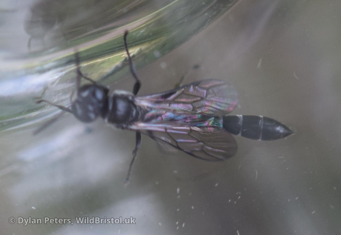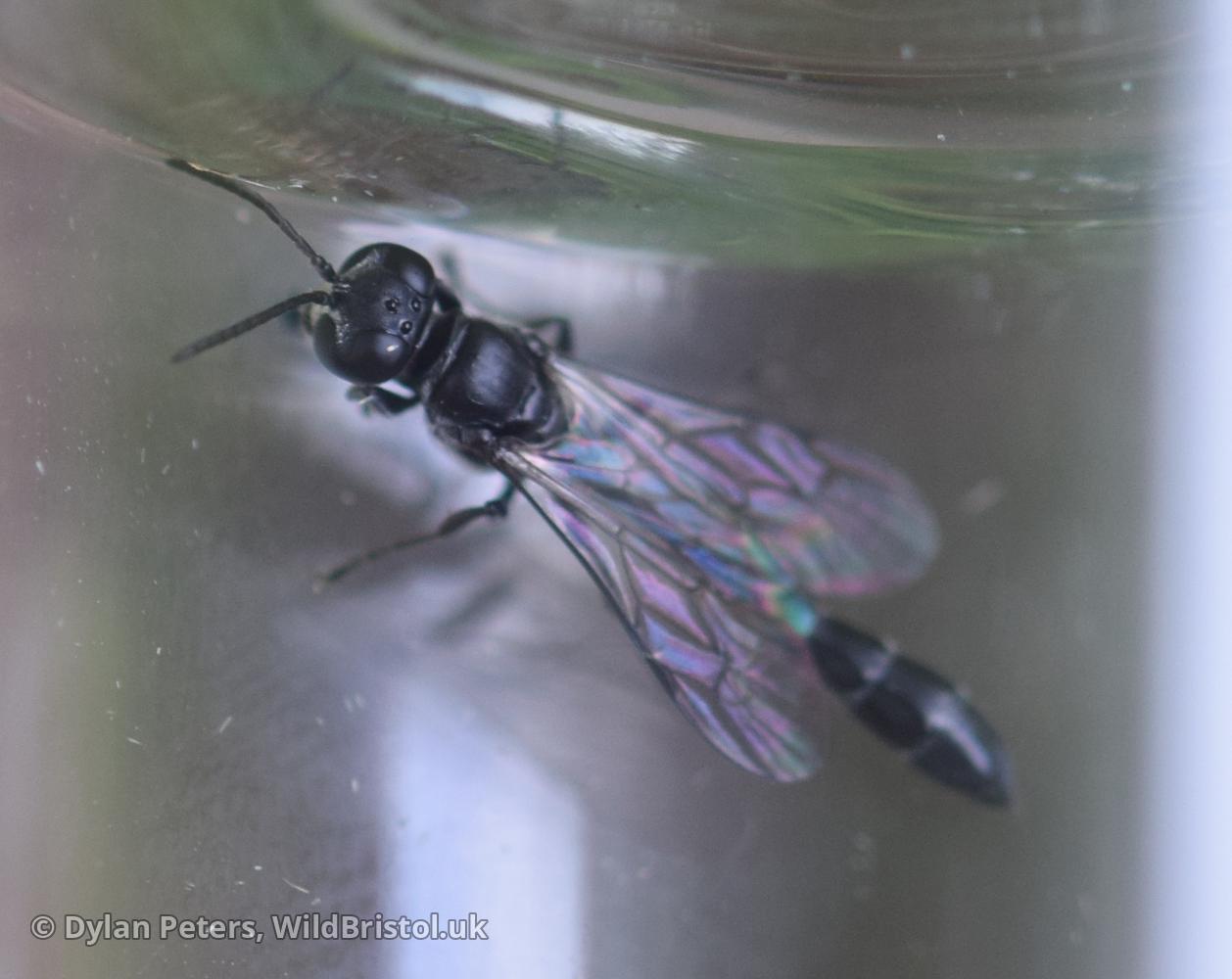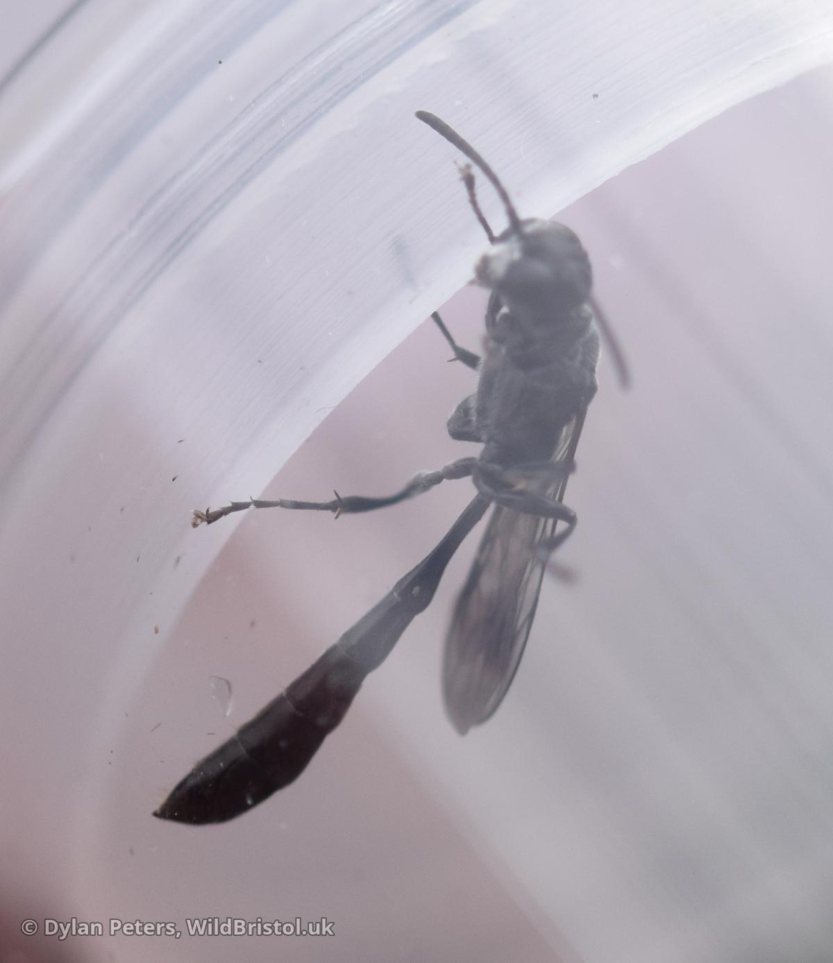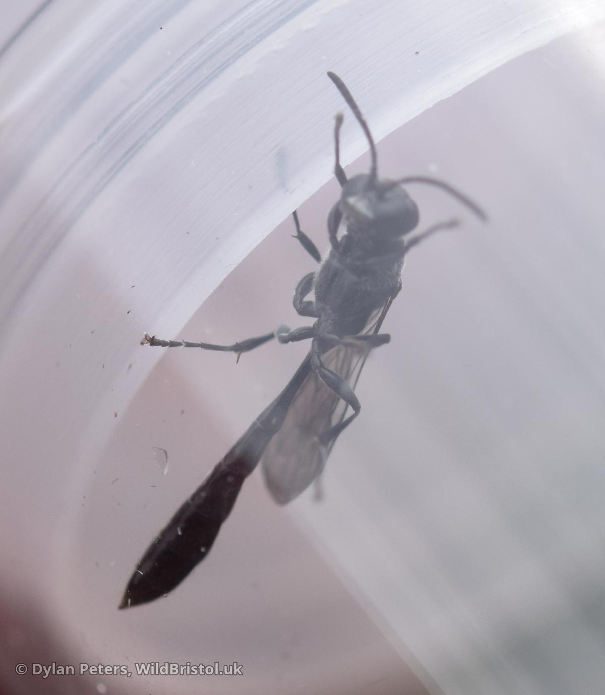 Widespread and fairly frequent in England and Wales, becoming scarce in Scotland. Habitat includes: gardens, parks, allotments, churchyards, woodland, field margins, old quarries, wetlands, heathland, grassland etc. Life story: nests in hollow stems such as brambles and Common Reed. which are provisioned with small spiders. Length: 8 mm.
