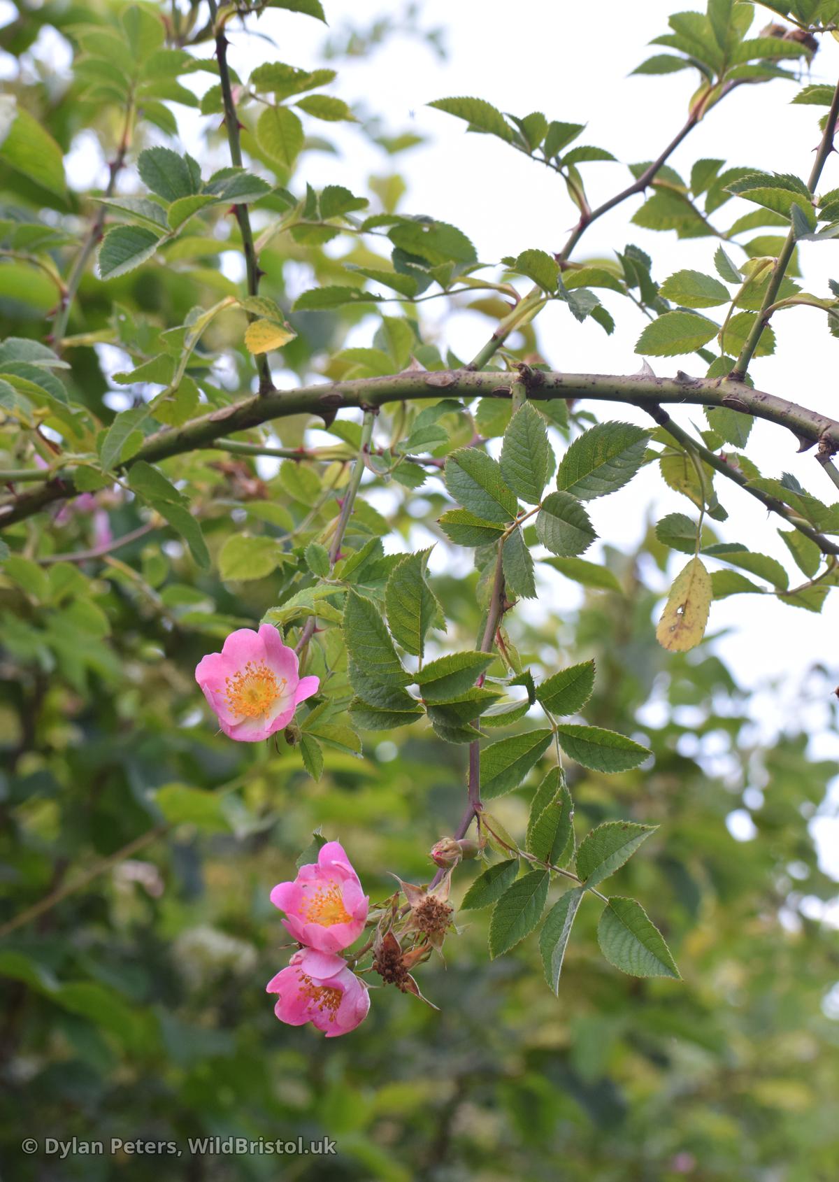 Stems arching, to 3(4)m, with hooked prickles; leaflets hairy on lowerside, uniserrate, eglandular; flowers 1-several, white to pale pink, 3-5cm across; pedicels 2-4cm, usually glandular-hairy; fruit ovoid, 1-2cm, more or less glabrous; sepals reflexed after flowering, falling before fruit ripe; disc conical, with orifice about 1/5 its total width; styles glabrous, forming a column shorter than stamens but persistent in fruit; 2n=35, 42. Native; hedges, scrub, wood-borders; Britain and Ireland South of a line from County Dublin to East Suffolk, but now rarer than formerly.