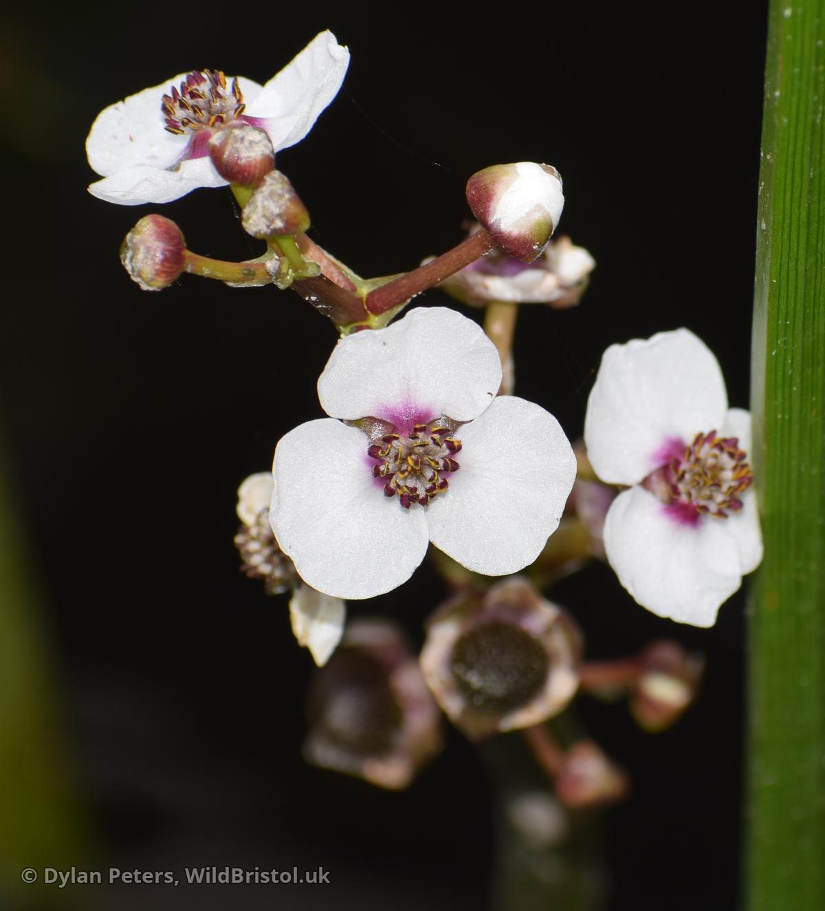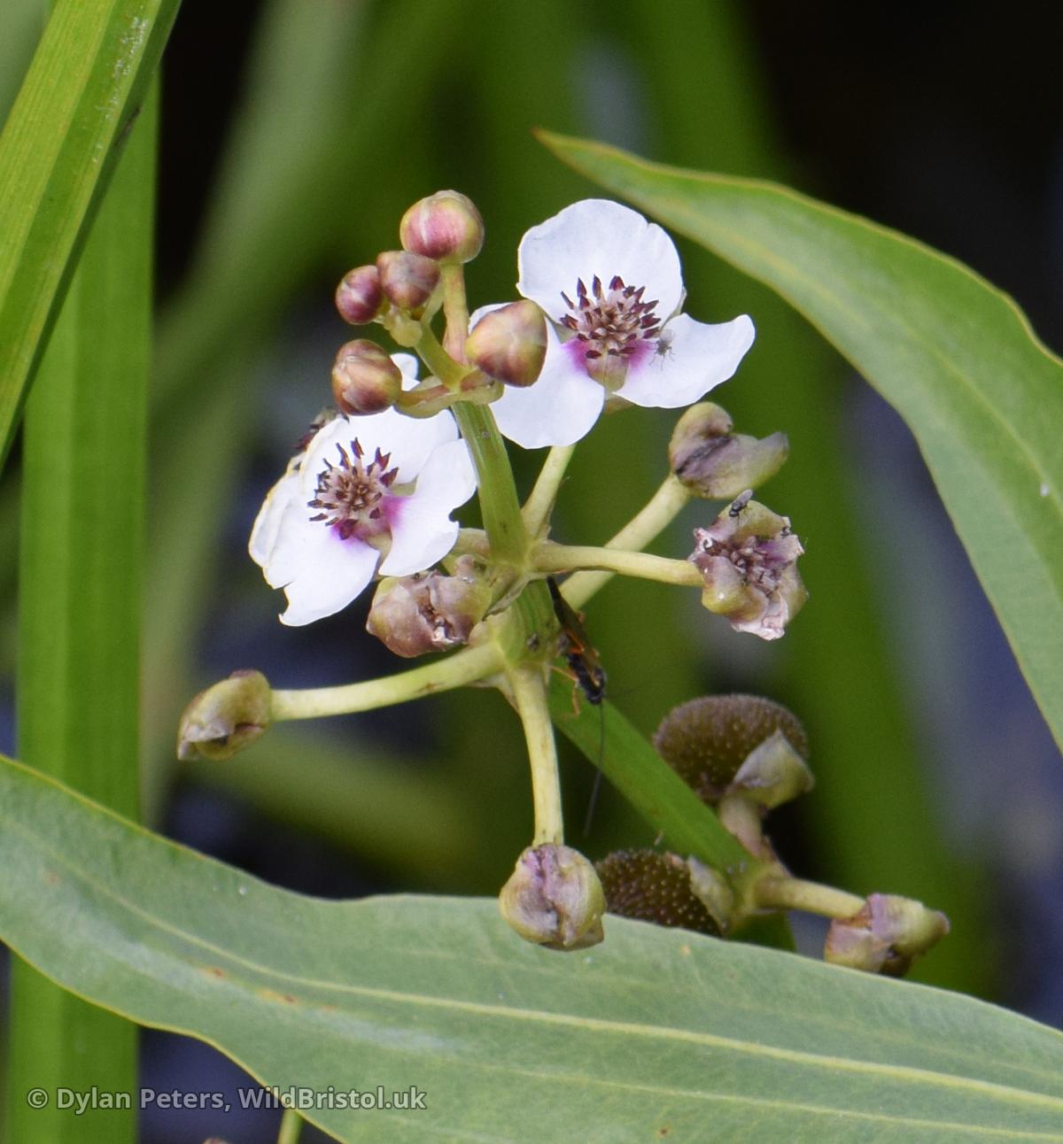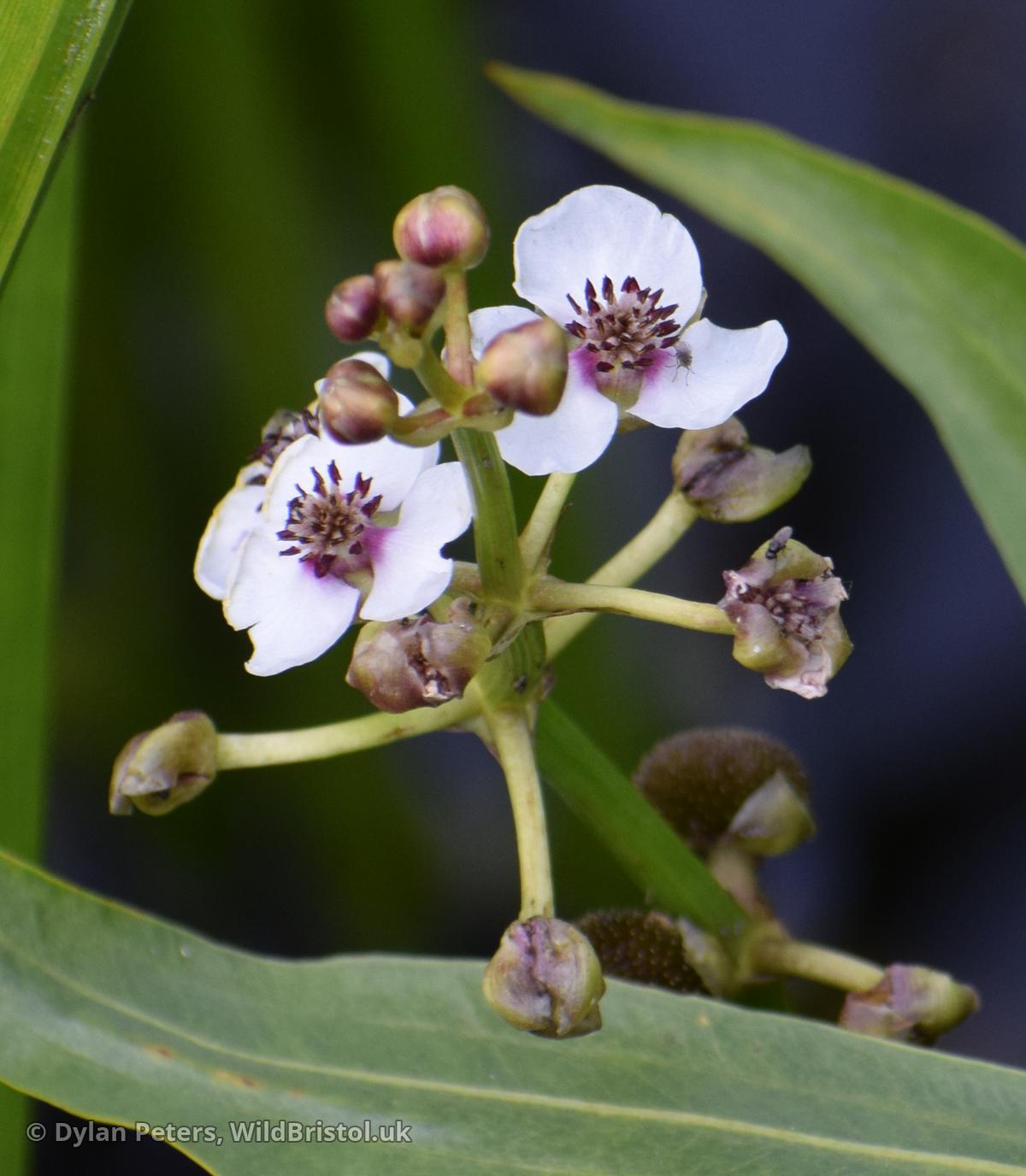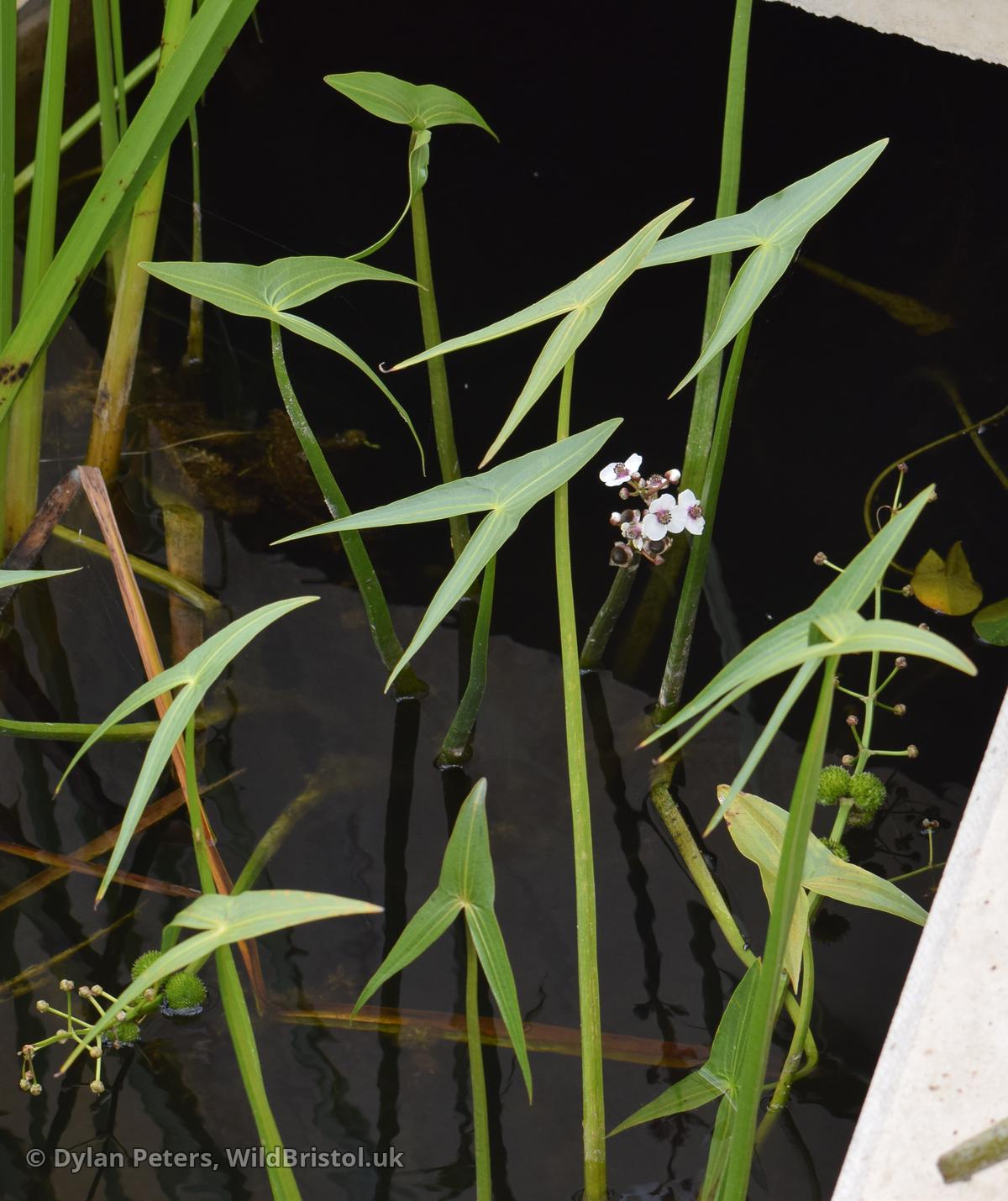 Stems emergent, to 1m; emergent leaves strongly sagittate; floating leaves often elliptic; submerged leaves linear; flowers 2-3cm across; achenes 4-6mm, with beak <1mm; (2n=16, 20, 22). Native; in ponds, canals and slow rivers; frequent in England, very scattered in Wales and Ireland, introduced elsewhere.