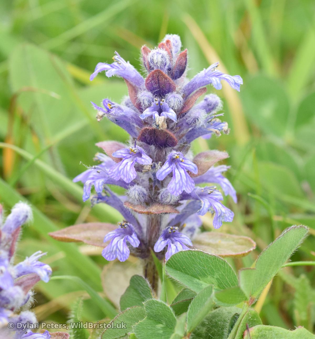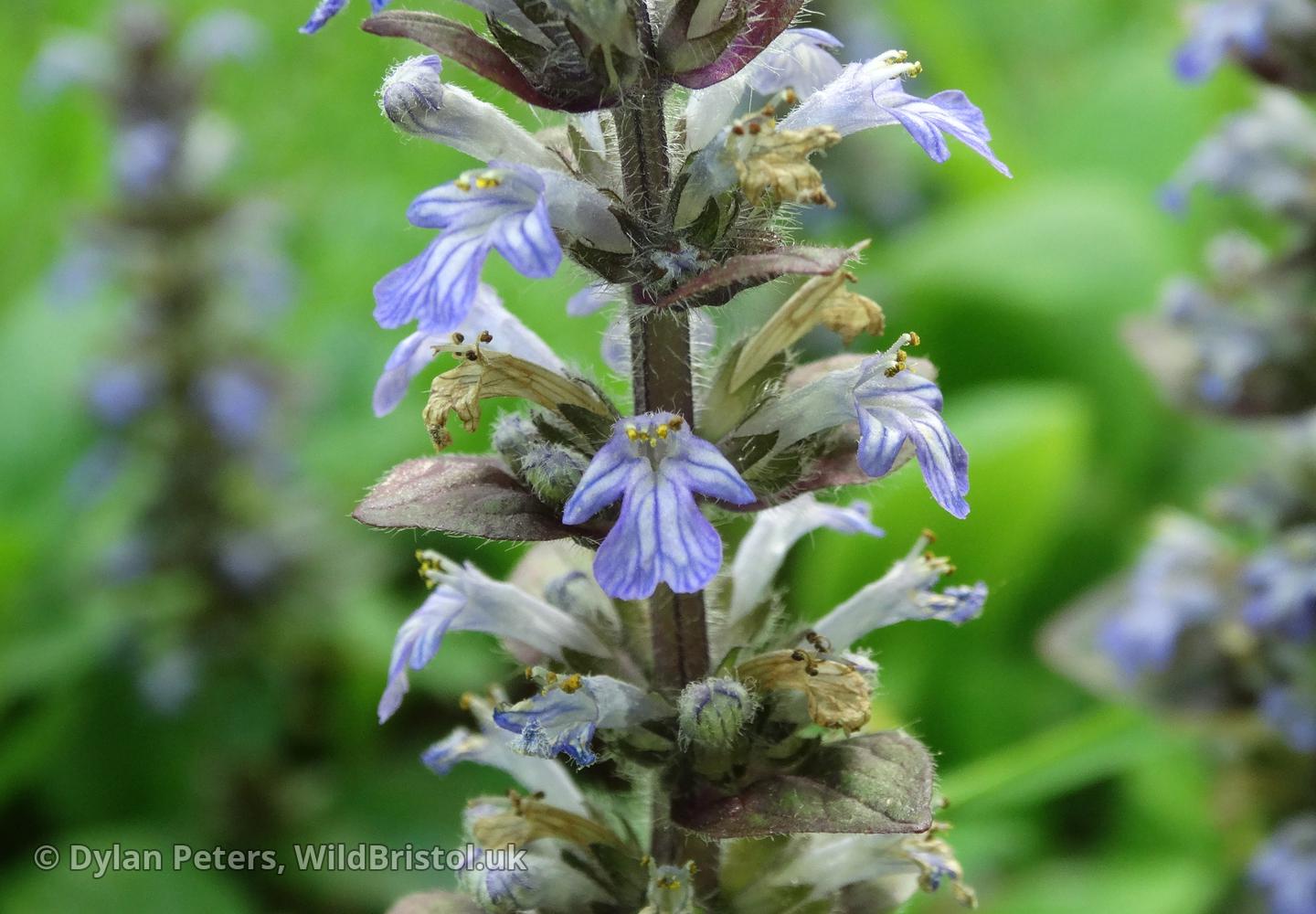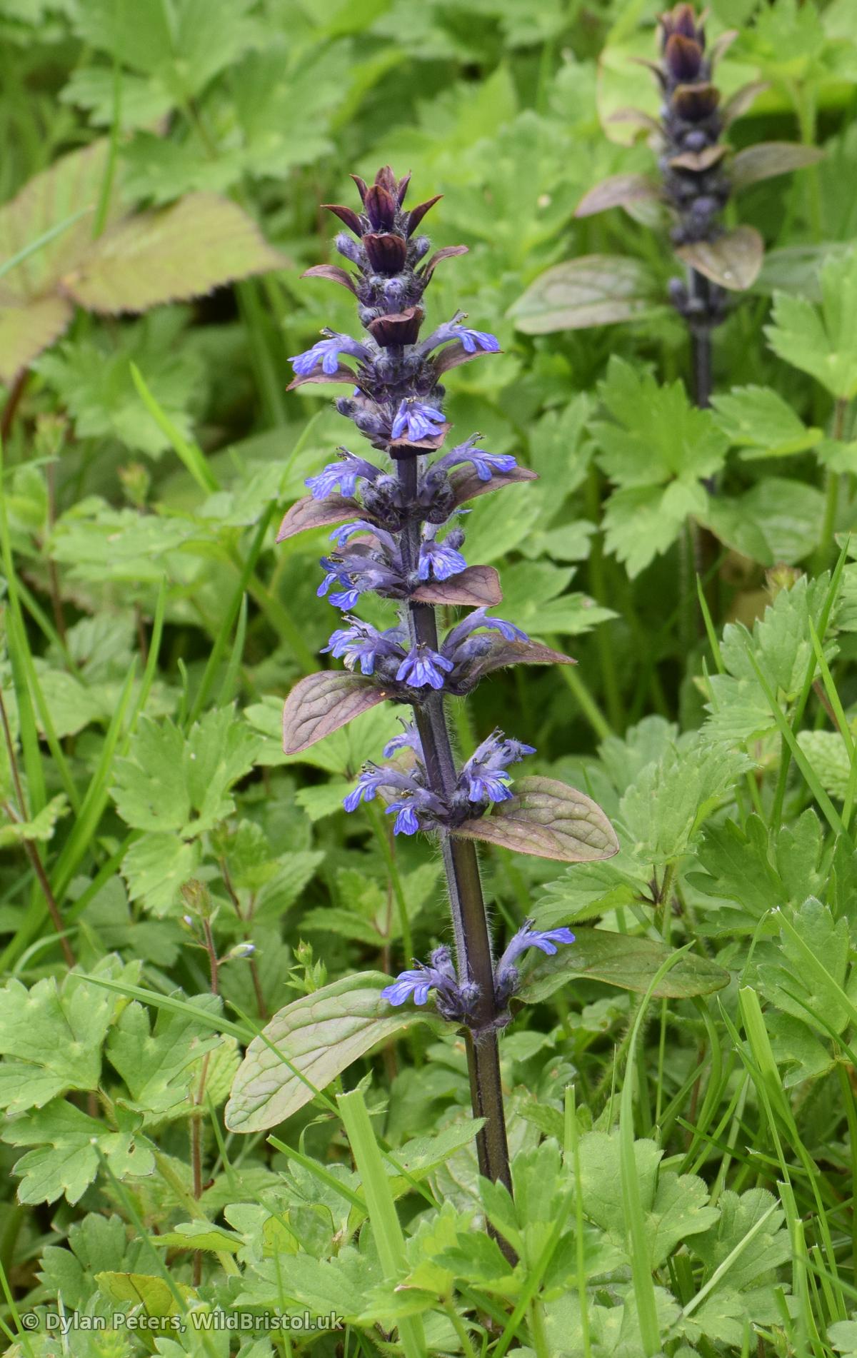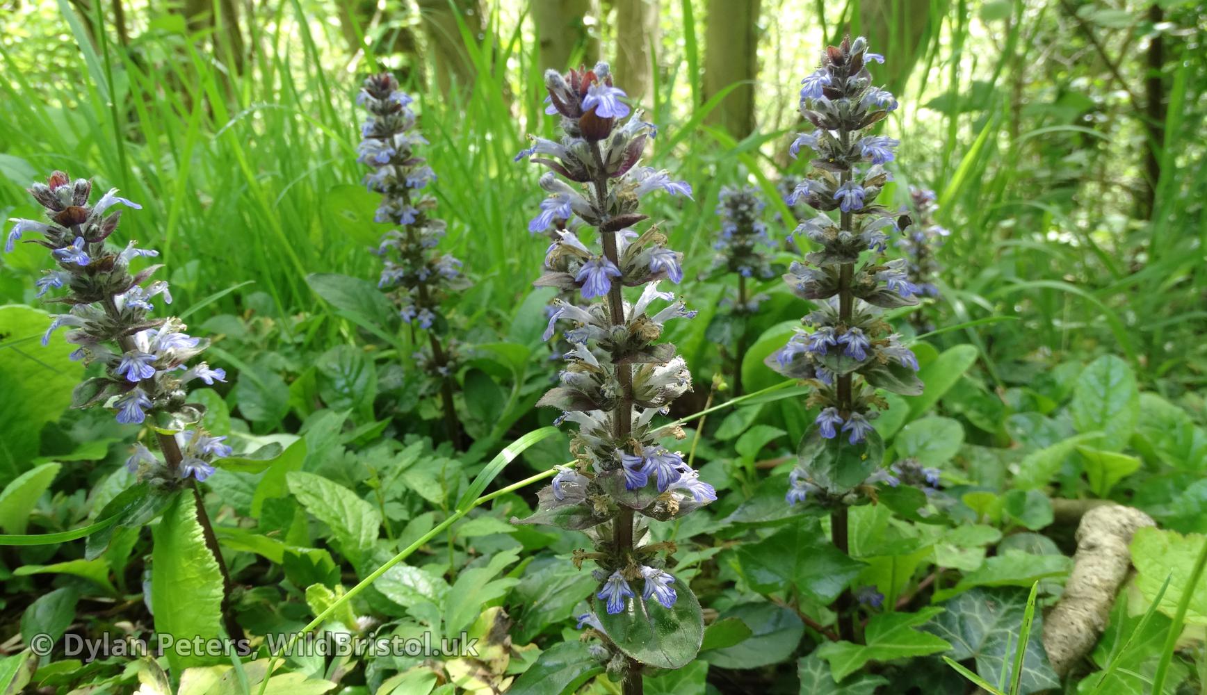 Widespread and fairly frequent throughout the UK. Habitat includes: Damp places such as woodland, hedgerows, meadows, grassland, wasteland, cemeteries /churchyards etc. Height: Up to 20 cm Flowers: April to July. Other names include: Blue Bugle, Bugle-herb, Bugle-weed, Carpet-weed, Carpet Bugle-weed, Common Bugle, St. Lawrence Plant. Rhizomatous Perennial.