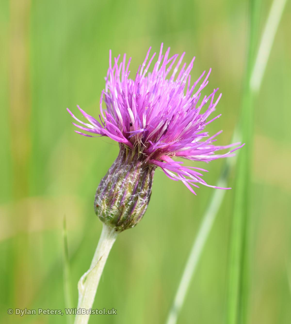Erect perennial to 80cm; stems with only very reduced leaves in upper part, not winged; leaves scarcely to rather deeply lobed, softly spiny, white-hairy on lowerside; capitula 1.3-2.5 x 1.2-3cm (excluding flowers); flowers purple; 2n=34. Native; fens, bogs, wet fields on peaty soil; very local in England and Wales North to North East Yorkshire and Caernarfonshire, throughout Ireland, very local in West Scotland.