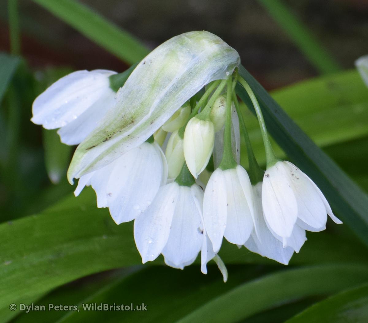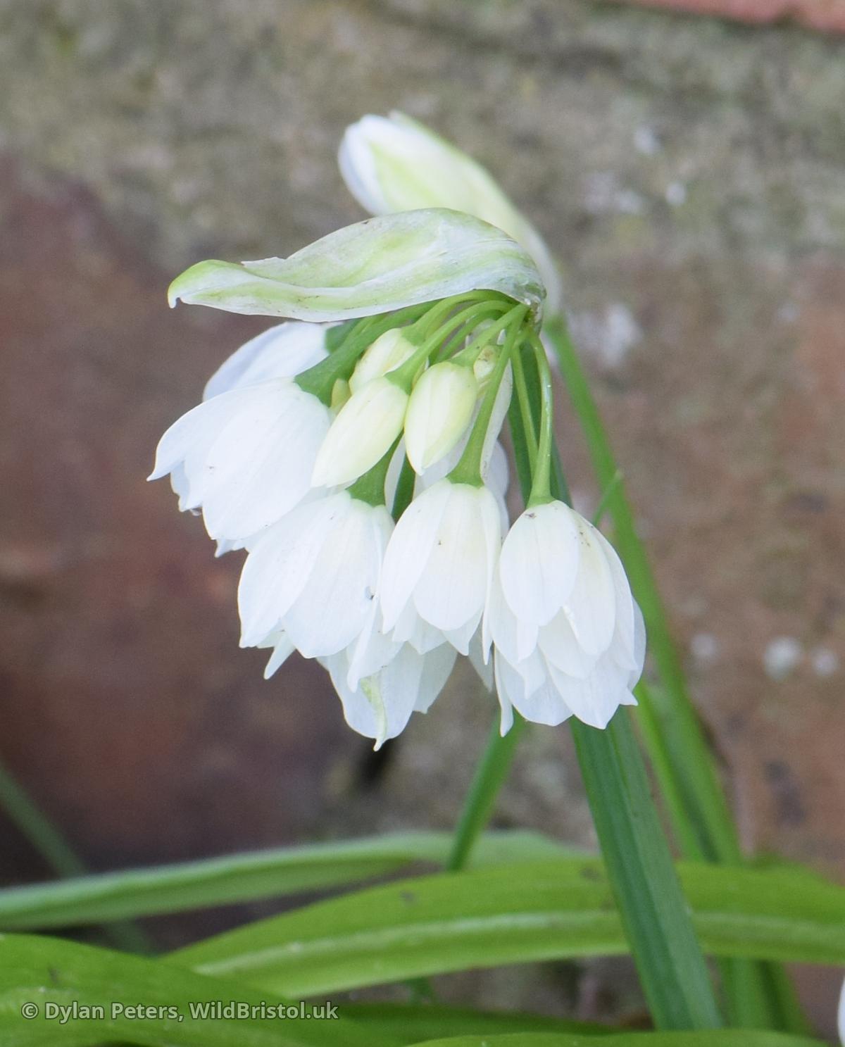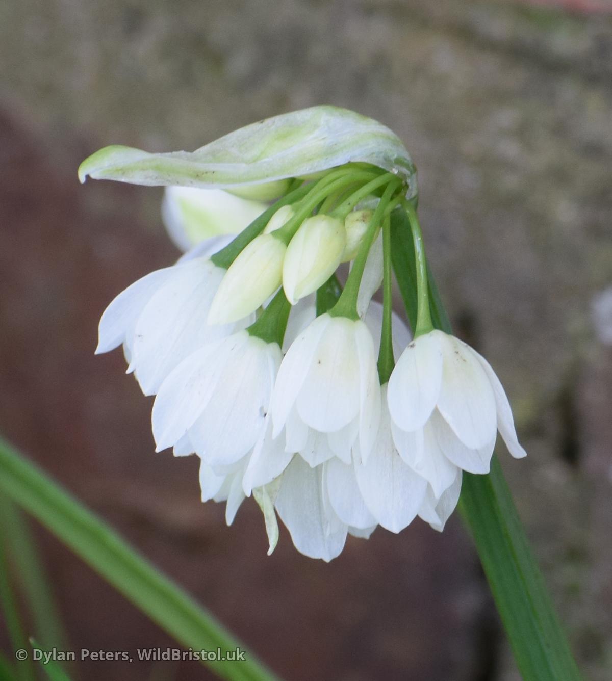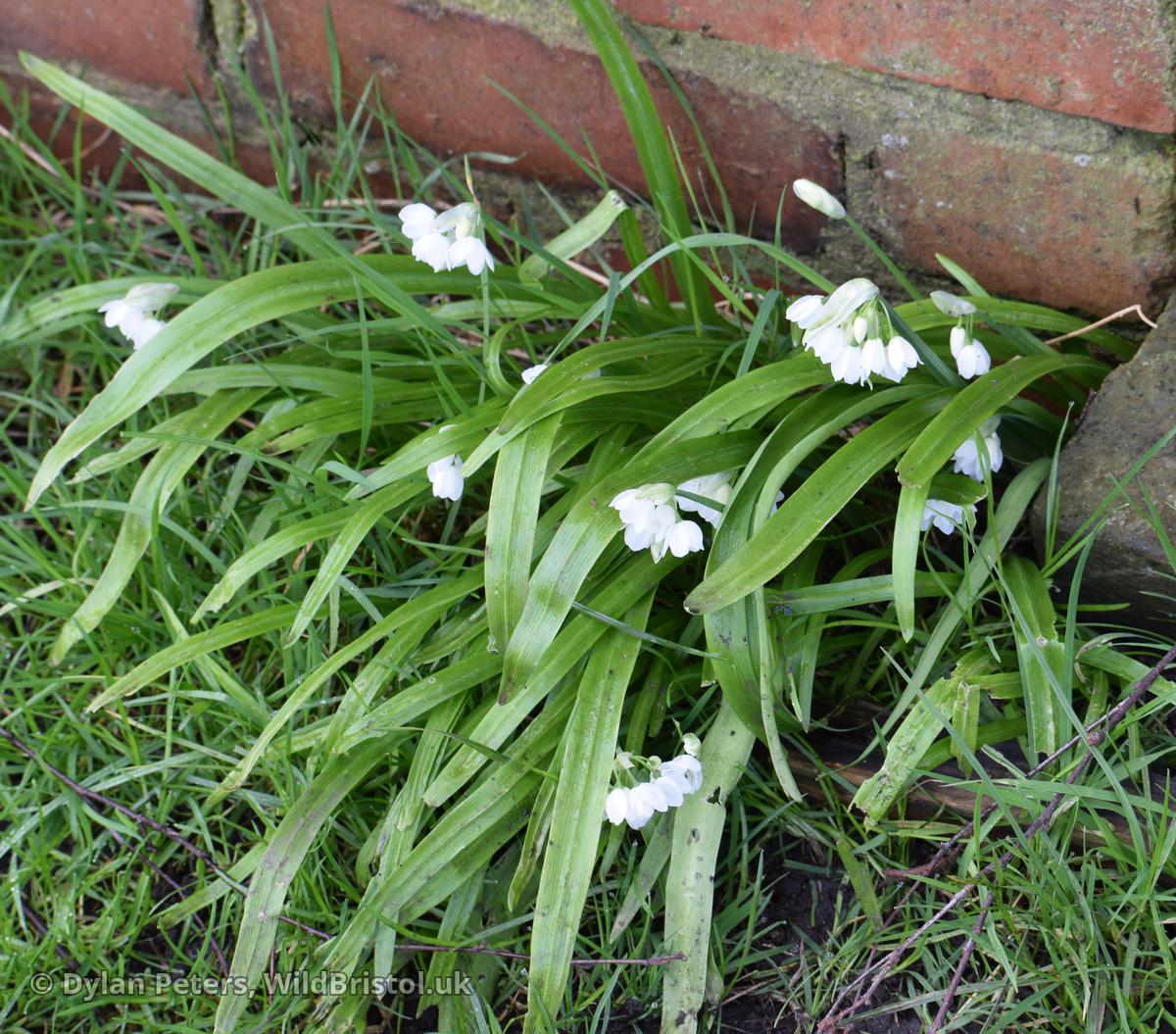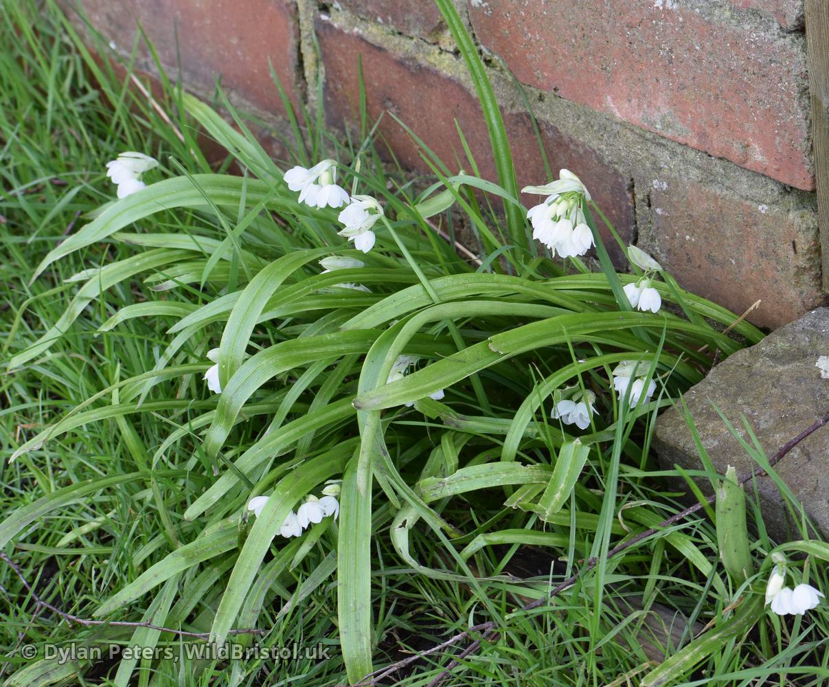 Stems to 40cm, triangular in section with acute angles; leaves flat, keeled, 5-25mm wide; inflorescence of bulbils with or without flowers (most commonly with only 1 flower) or rarely with only flowers; tepals 10-12mm, white; stamens shorter than tepals; filaments simple; (2n=16). Neophyte-naturalised; woods, grassy places, rough ground and waysides; scattered through much of Britain and Ireland; Caucasus. Plants without bulbils are grown in gardens; they have not been reported from the wild but are allowed for in the key.