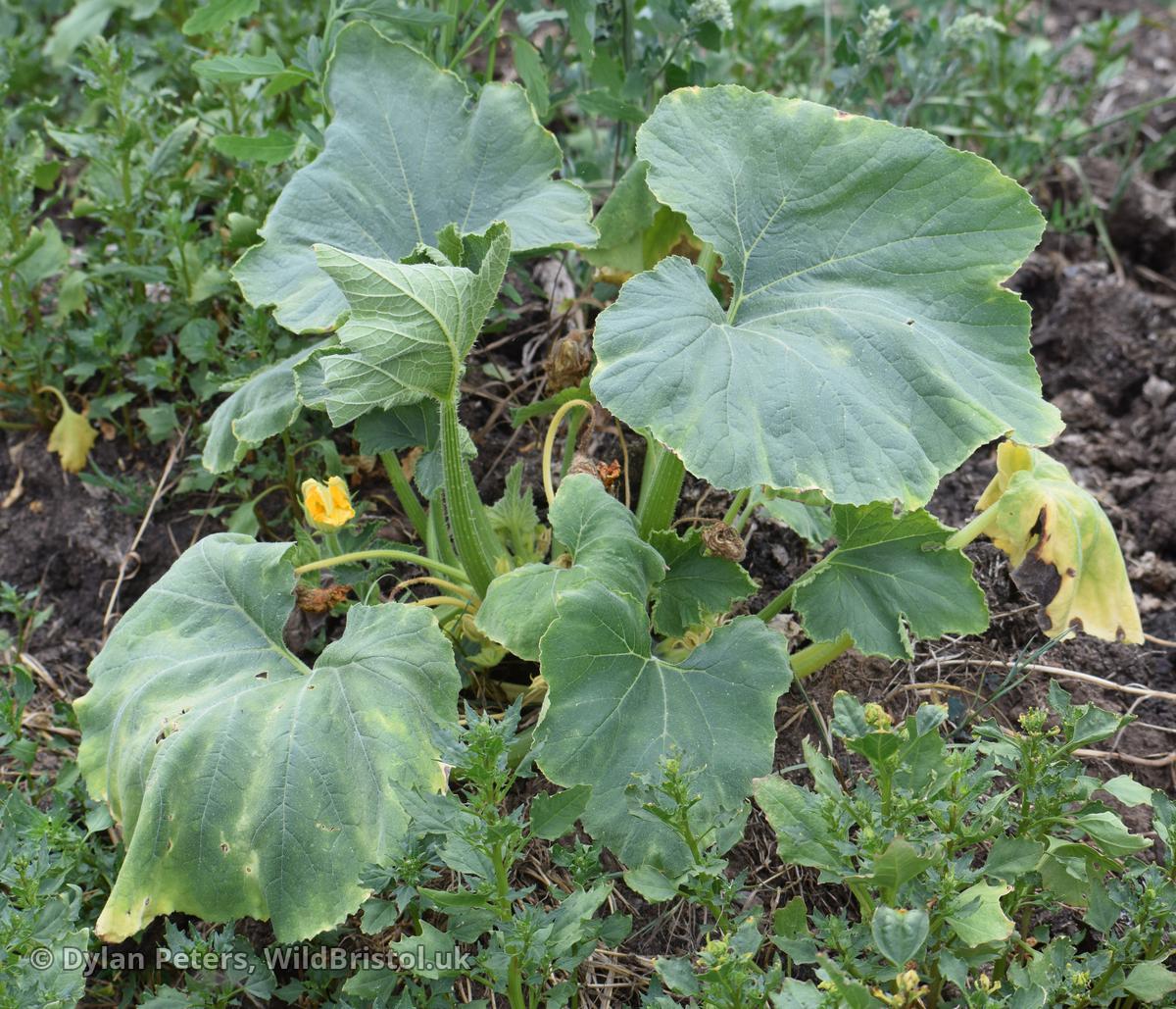 Commonly grown throughout the UK and sometimes escapes. Habitat includes: allotments, tips, sewage works, spoil heaps (especially manure heaps) etc. Very similar to Pumpkin (C. maxima) but differs in its less trailing and branching habit; usually with one main shoot and diagnostically by its shorter, thicker fluted (deeply ridged) female pedicel (thinner and terete in C. maxima).
