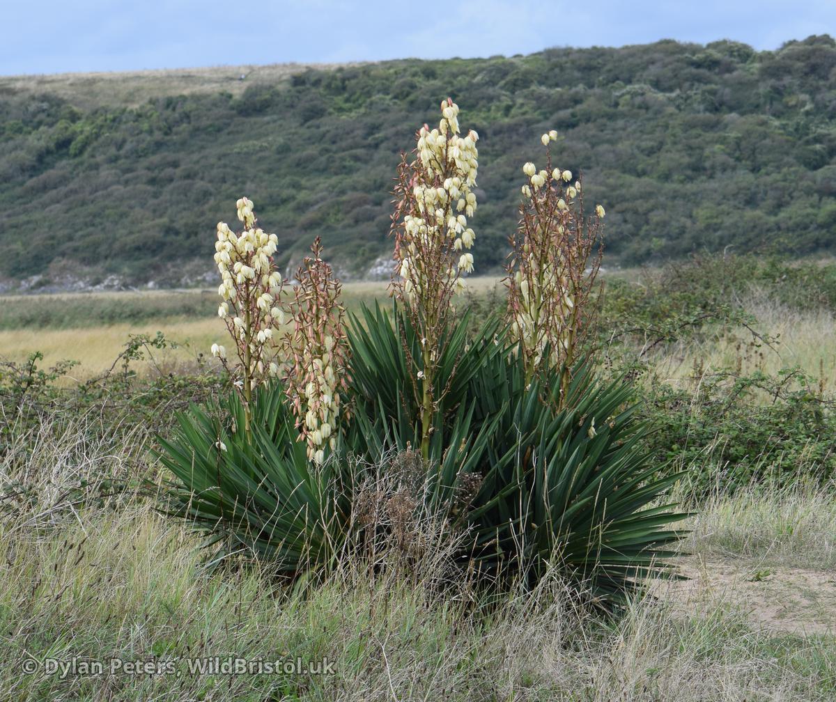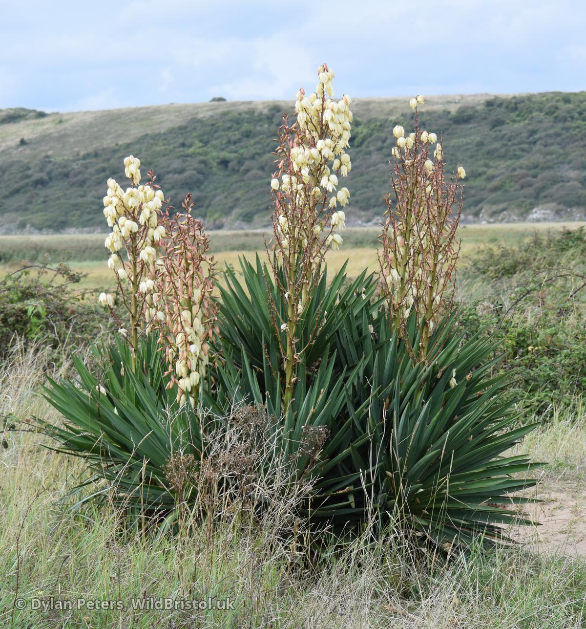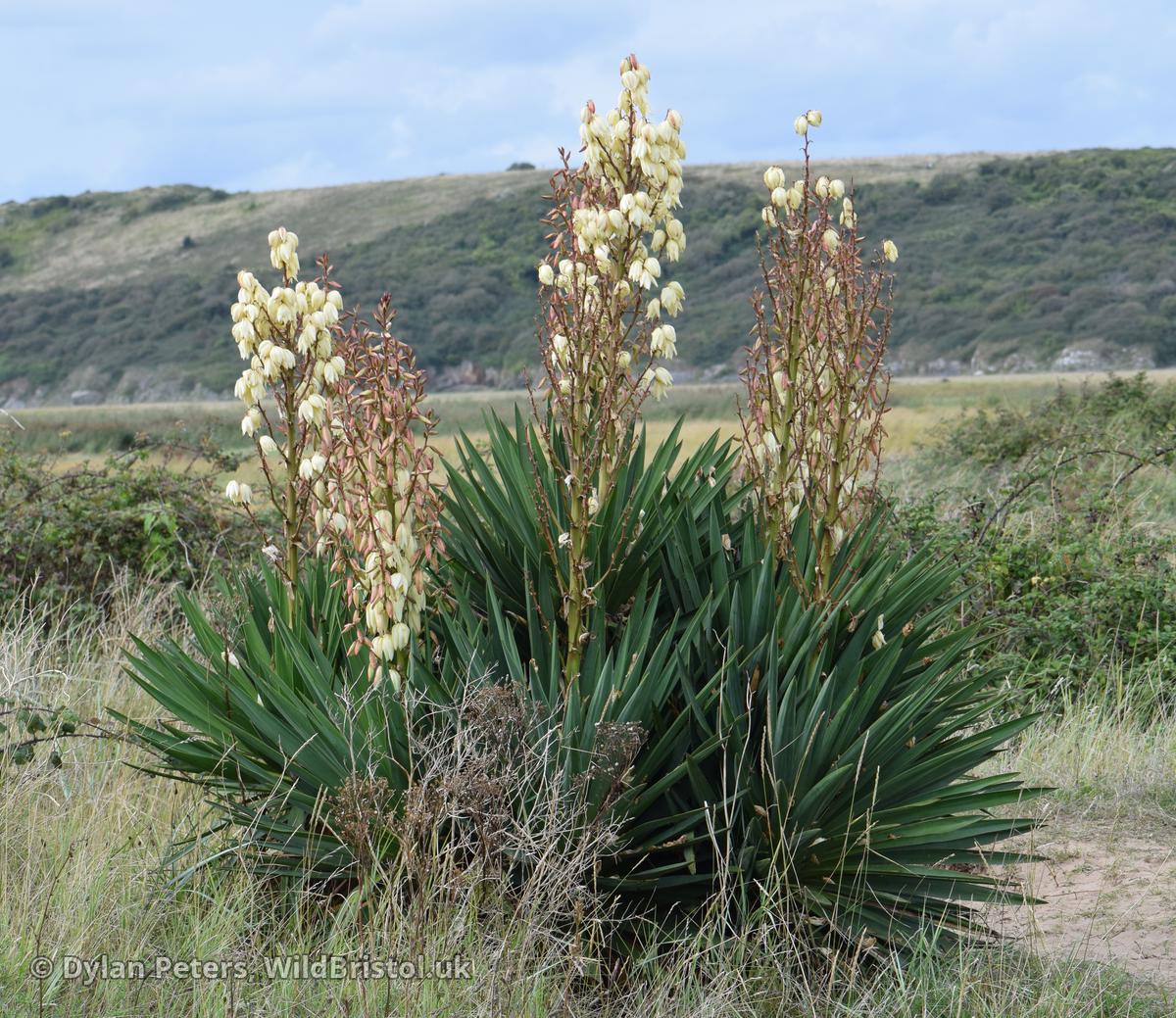 Plant to 2(5)m; leaves ≤100 x 5cm; perianth 5-8cm; (2n=60). Neophyte-survivor; on sand-dunes and in gravel-pits, mostly maritime; persistent in South West England and South & North Wales, less so in South East England North to West Lancashire, Channel Islands, South Kerry, County Waterford; South East USA. Plants with strongly recurved leaves re referable to var. recurvifolia (Salisb.) Engelm.; both vars. occur with us.